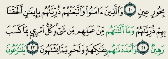 عرض الآية الكريمة مظهرًا من مظاهر اللطف الإلهي والفضل الرباني، مما يناله عباده المؤمنون في يوم القيامة. هذا المظهر هو أنّ الأبناء (وإن ضعف إيمانهم ونقص عملهم الصالح) يُلحقهم الله – سبحانه وتعالى – بدرجة آبائهم في الجنة؛ إسعادًا لهؤلاء الآباء وتقديرًا لهم